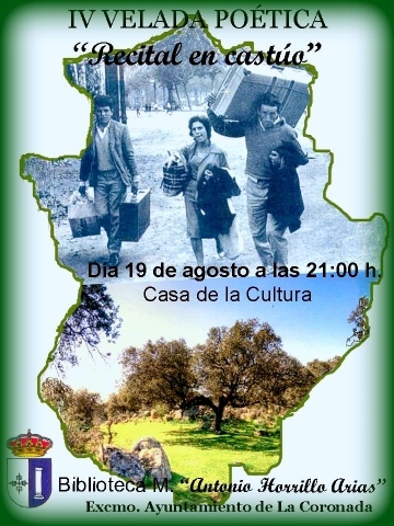 El pasado lunes día 13, tuvimos el ensayo general de la IV velada. En él presenté el cartel anunciador y el programa del acto. Repasamos en la casa de la cultura junto con la proyección de imágenes todos los poemas de los lectores/as que allí se encontraban. Faltaron algunos, era de esperar, y además el chico que iba a tocar la guitarra. Aún así ensayamos y quedó muy bien. La proyección habrá que modificarla, no encajaron muy bien algunas imágenes y solo hay que buscar otras. Luis Calvo se ha ofrecido como todos los años ayudarnos. Quedamos una hora antes el día de la Velada para organizar y dejarlo todo listo.